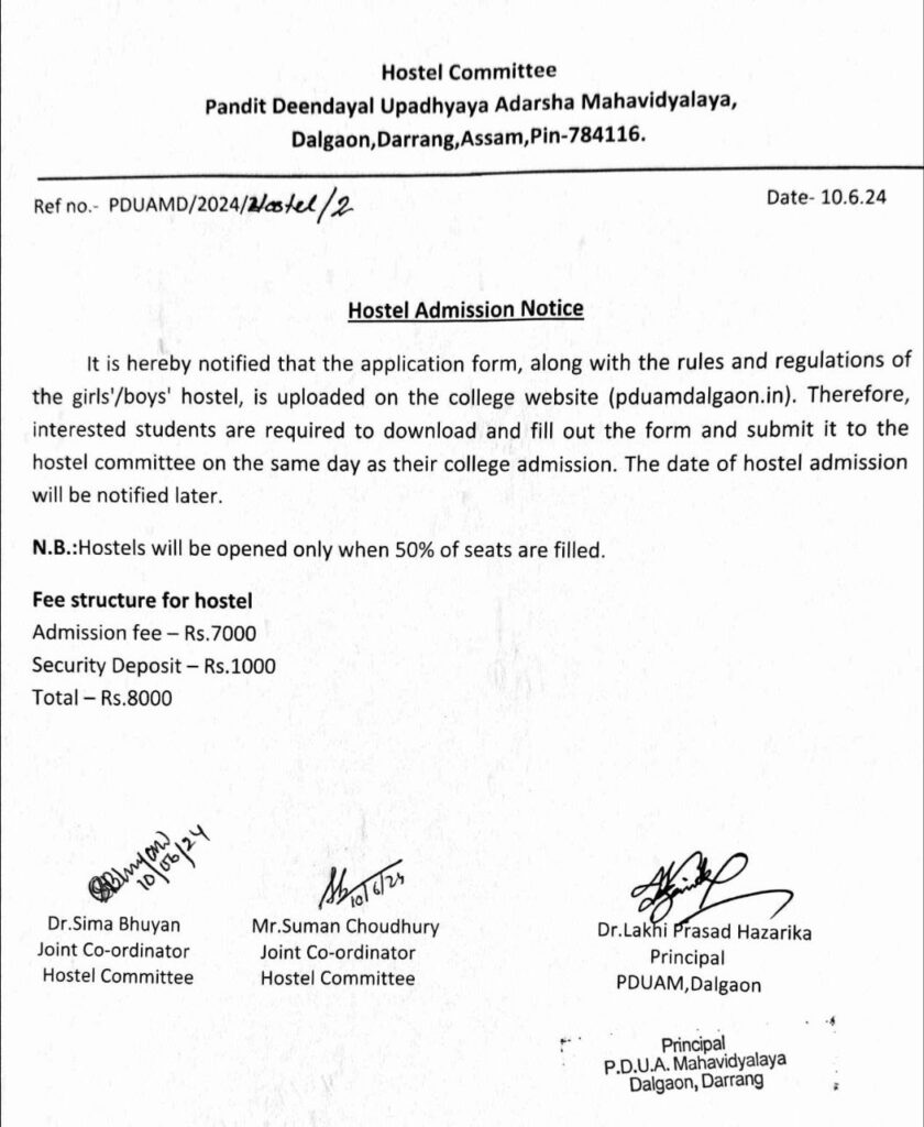 Hostel Admission 24-25Applications are invited from students (Both Boys and Girls) of PDUAM Dalgaon for Admission to the college hostel for the session 2024-25Hostel Admission FormHostel Rules